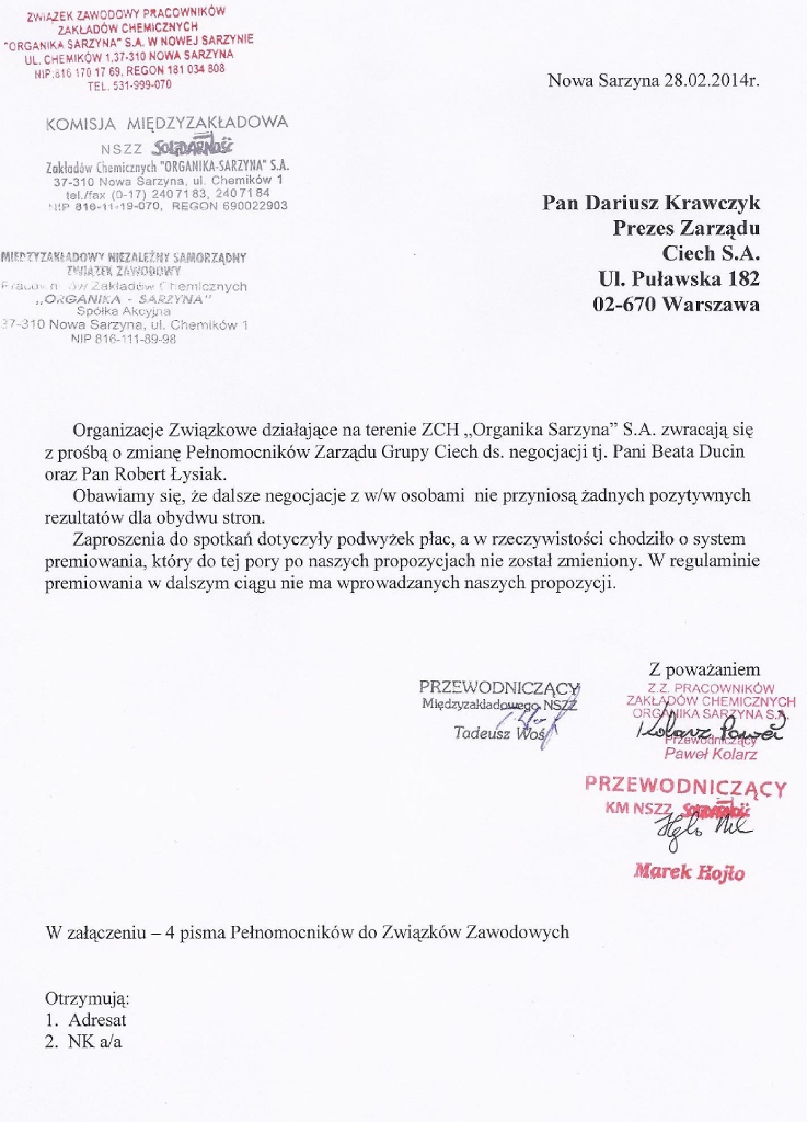 Aktualności, Ciech, Pisma Pismo do Prezesa Zarządu Ciech S.A. by admin • 2 marca 2014 • Możliwość komentowania Pismo do Prezesa Zarządu Ciech S.A. została wyłączona Zapraszamy do zapoznania się z pismem, jakie organizacje związkowe wystosowały do Prezesa Zarządu Ciech S.A. Pana Dariusza Krawczyka: